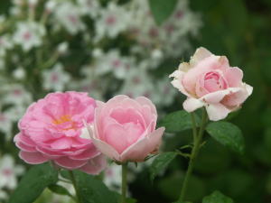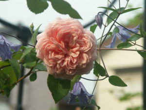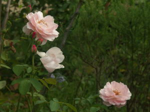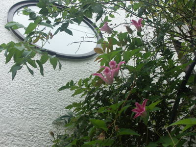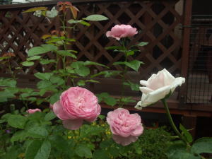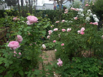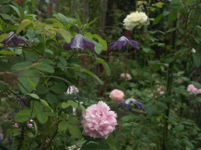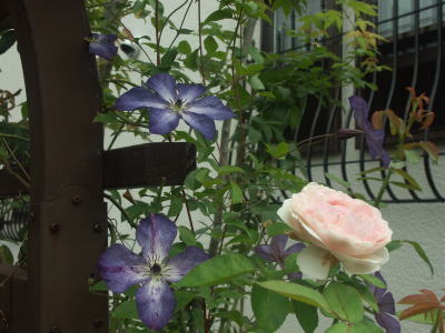 ![]() | ピンクの花は コンテドゥシャンポール クレマチスはエレバン その向うに見える クリーム色に見えるバラは ERクロッカスローズです |
