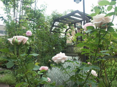 | パーゴラのベンチの後ろは クレマチスのベティコーニングが 可愛いです フルディーンの蕾も 目立つようになってきています | ![]() |