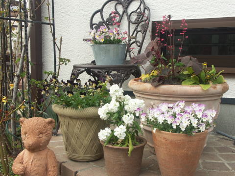 ![]() | 椅子の上のビオラはももの 濃い色のビオラはちどり 一番手前のビオラはフェアリーチュチュ 白い花はストックです 大きなコンテナの中は ゴールドレースに ヒューケラが3種入ってます |