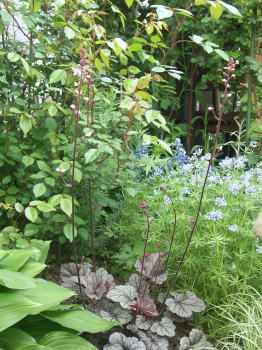 この季節、楽しみなヒューケラなどのカラーリーフの芽吹きとかわいい花のオダマキ達