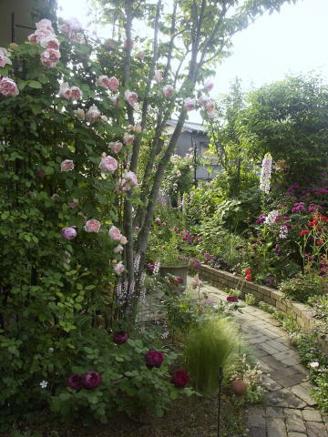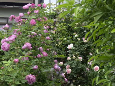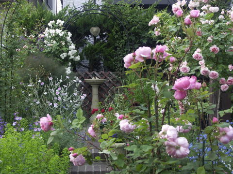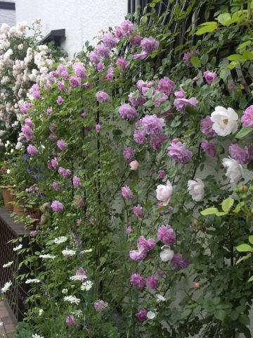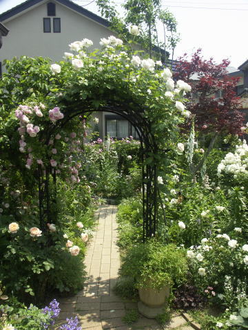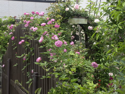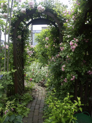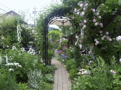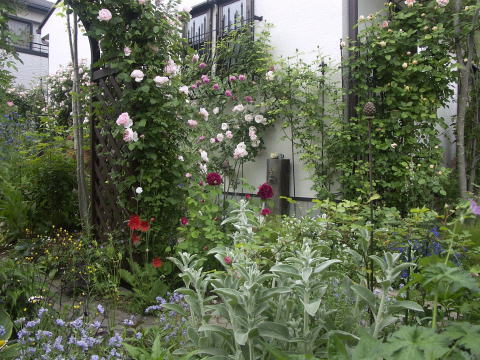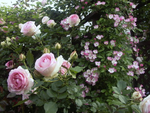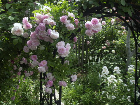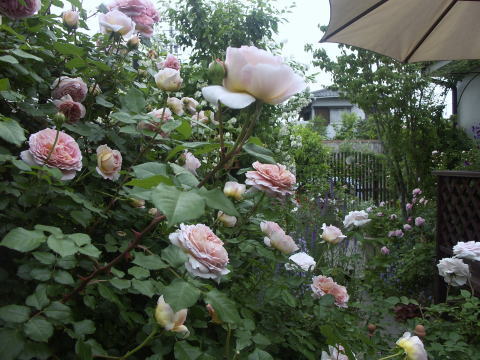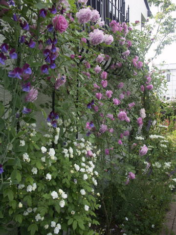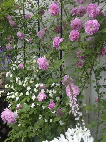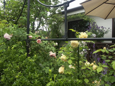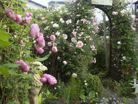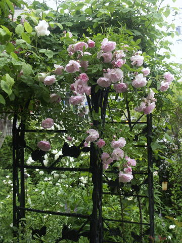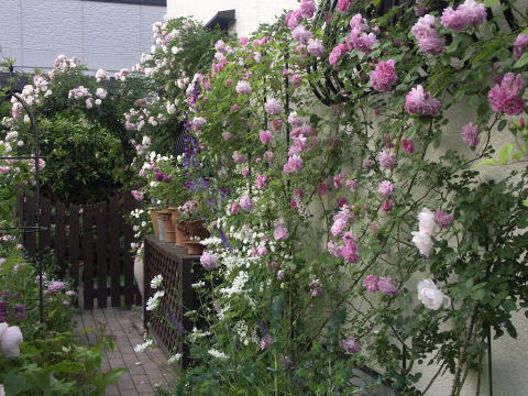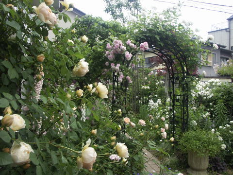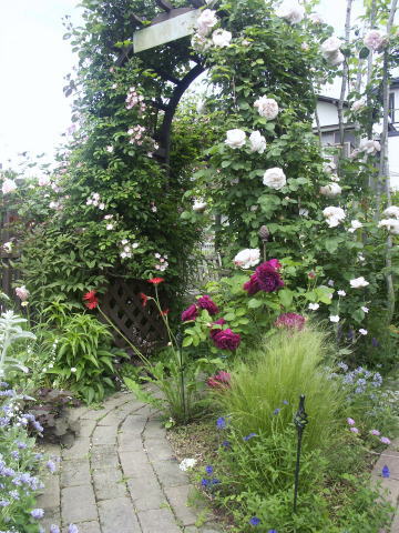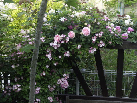 ![]() バーゴラはロンサール、バレリーナ、ブルボンクイーン、クレマチスのフルディーンとベティコーニングが仲良く咲いてます | |