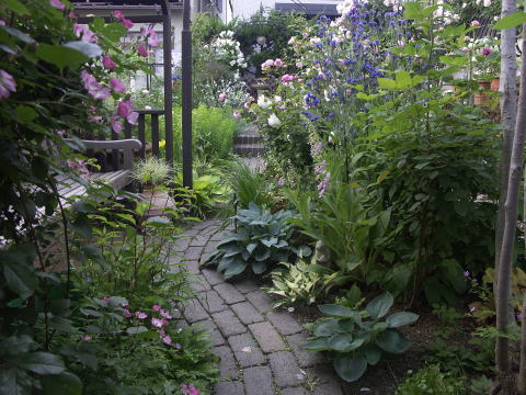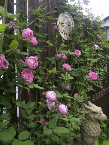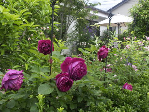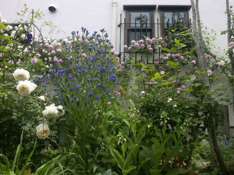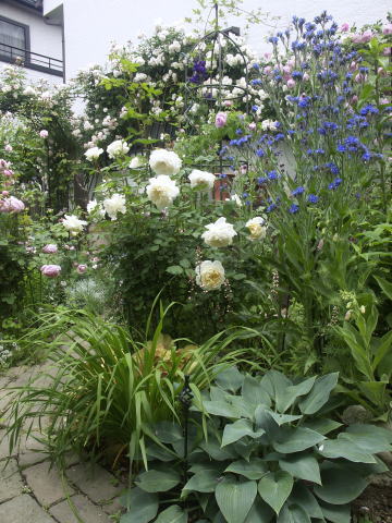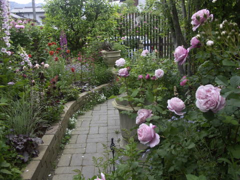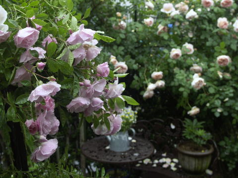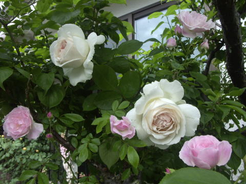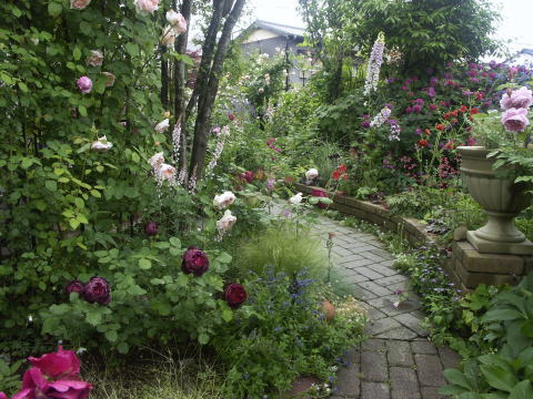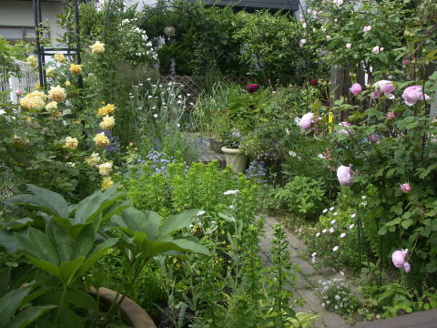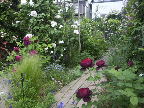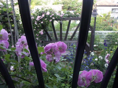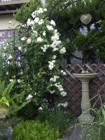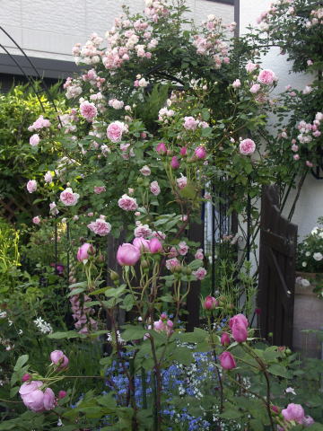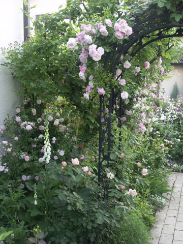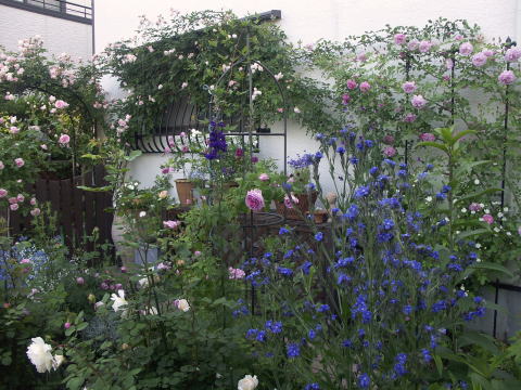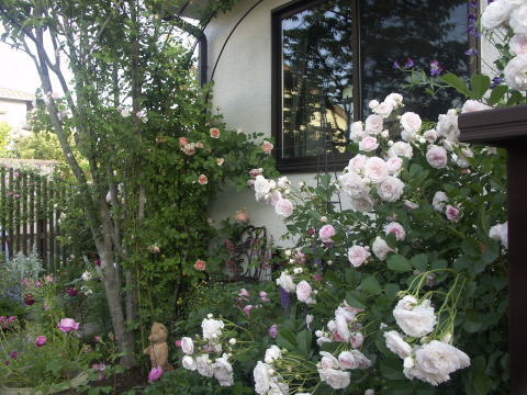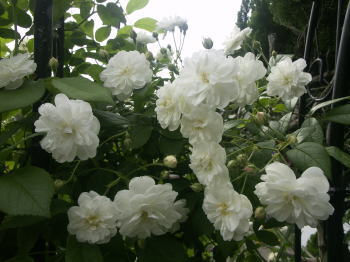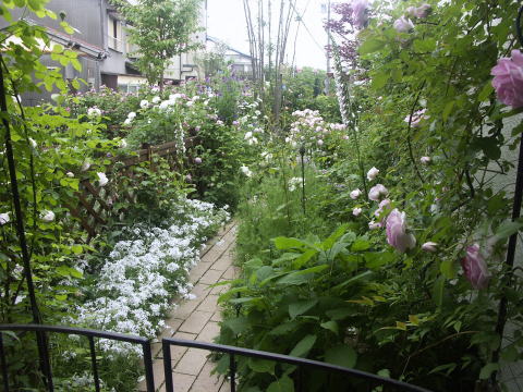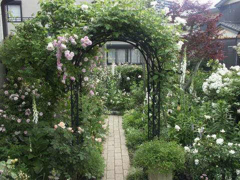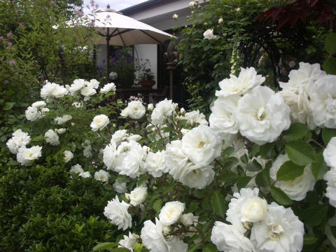 ![]() バーゴラはロンサール、バレリーナ、ブルボンクイーン、クレマチスのフルディーンとベティコーニングが仲良く咲いてます | |