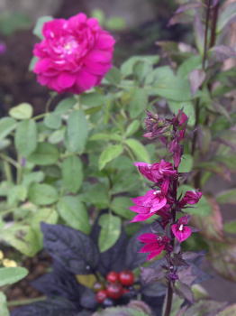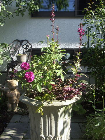 ![]() | ![]() 寄せ植え バラはジェームスヴェイチ 沢ギキョウのファン 観賞用トウガラシのブラックパール イレシネ パープルレディ リシマキア ヌンムラリア |