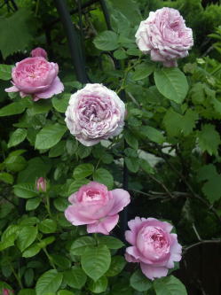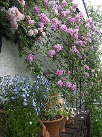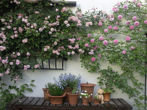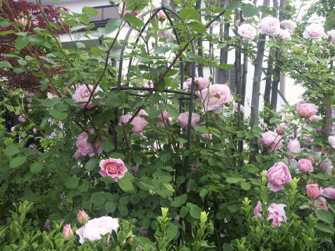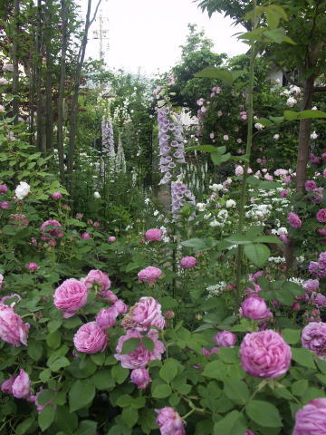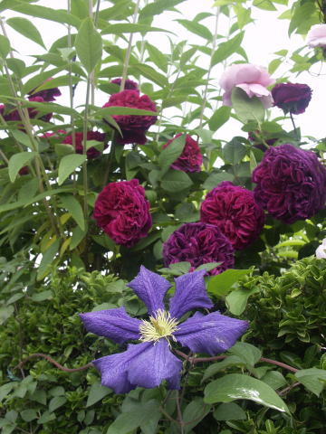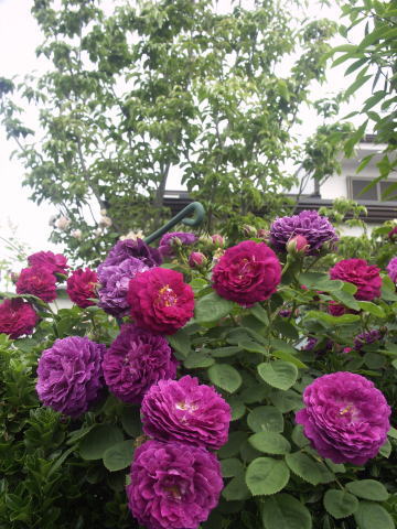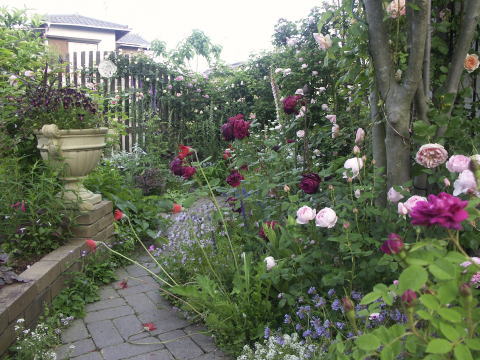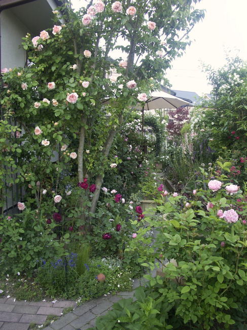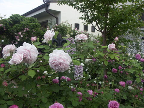 ![]() ヤマボウシに誘引してあるバラはER エブリンです 根元の赤バラはER スクワイヤー、青い花はベロニカ ブルーフォンテン 手前のピンクのバラはER コテージローズ | |