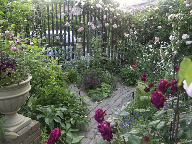 ![]() | 来客用の駐車場 濃いピンクはルイーズオディエ 白い花はブルドゥネージュ 薄ピンクはER シンベリン |