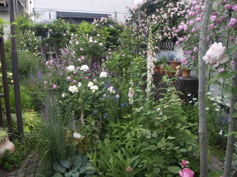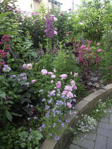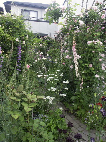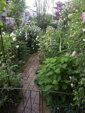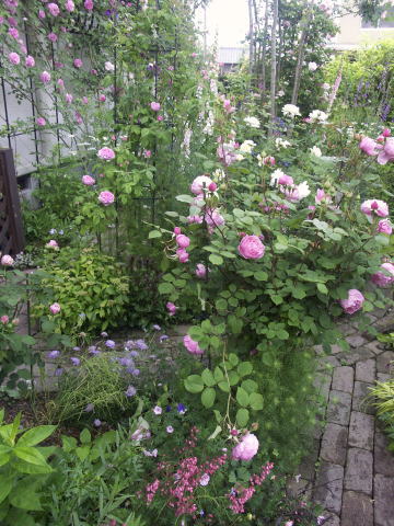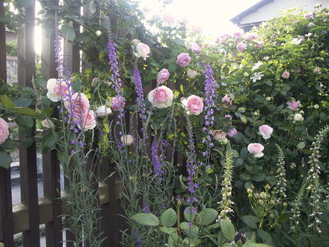 ![]() | キッチンガーデンの階段横は ピンクのシレネディオイカ ピンクの宿根リナリア バラはセントエセルブルガ 反対側は少し遅咲きのスワニー クレマチス 踊り場 |
