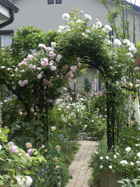 ![]() | アーチの足元にはホワイトメディランド ギボウシ オンファロデス リニフォリア |