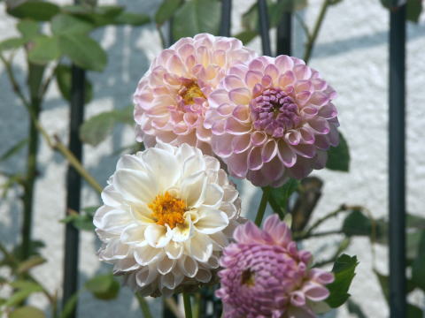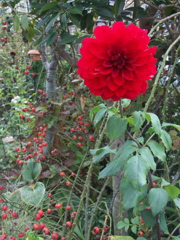 ダリア セクシーポーズ 開き始めも開いて蕊の部分が黄色くなった時も いつの時もなかなか可愛いし、いつの時の色も好きです 開きながら花びらが反り返りまん丸な球形になる どこから見ても可愛いでしょう~ | |