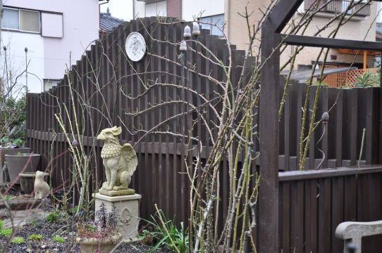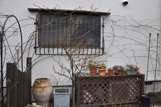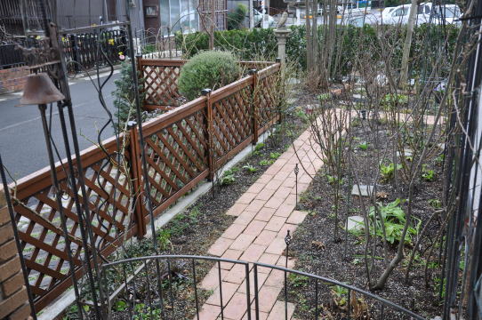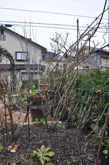ツルバラの誘引、ブッシュのバラの葉をとり仮剪定、宿根草の切り戻しなどをしてなるべくきれいにお掃除をします