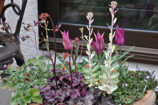 ![]() チューリップ 夢の紫、ペラルゴニウム レニフォル メブラック、ヒューケラ、ベロニカ マダムメルシェ‥ | |
