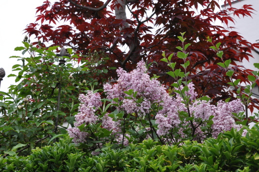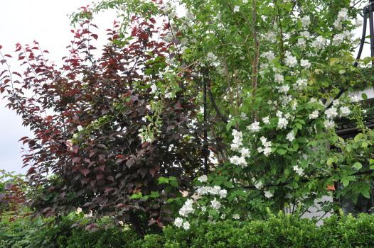 ![]() ![]() | ベニスモモの赤葉 バイカウツギの白い花 |