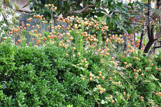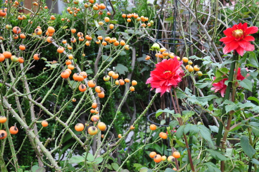 ![]() ![]() | ジプシーボーイのヒップです 生垣側はオレンジ色が 生垣に映えて秋を感じます 庭側はダリアとツーショット |