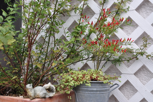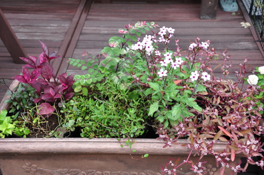![]() | スリット鉢を 季節ごとに入れ替えるプランター ぐら&べりんが デッキから庭に飛びださないための 柵の役目を兼ねている |