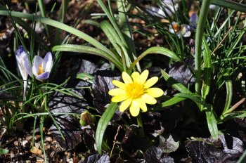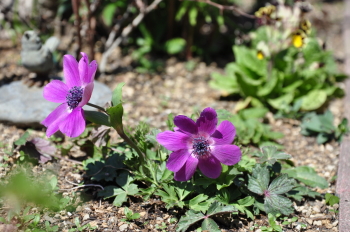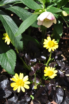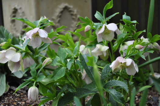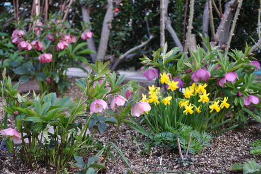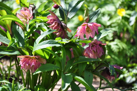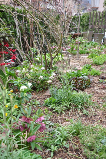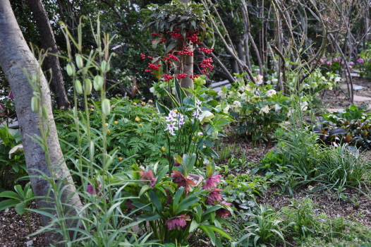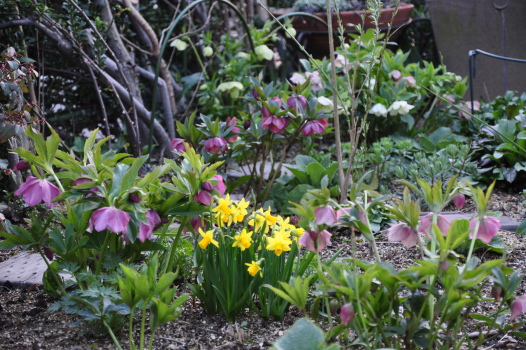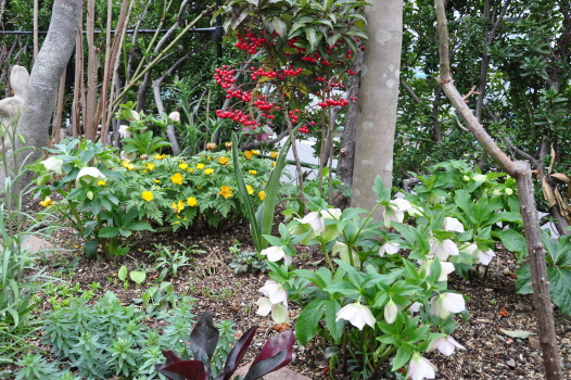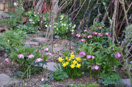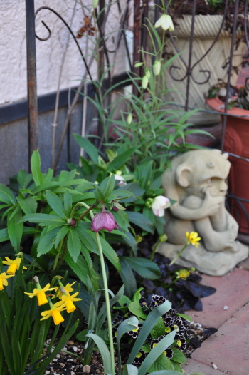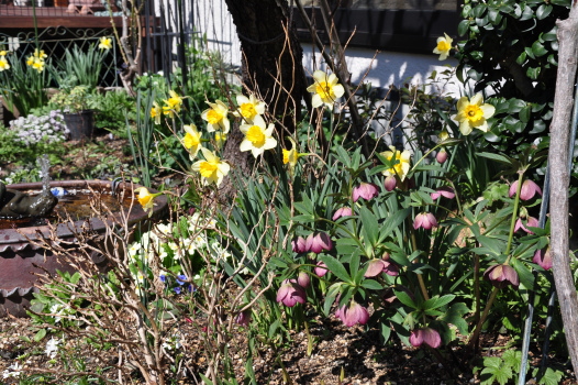 クリスマスローズの周りのようすも変わってきました ミニスイセンティタティタ、バイモユリ、ヒメリュウキンカの開花、周りの宿根草も大きく緑濃くなってきました |