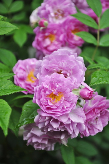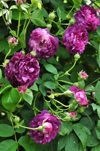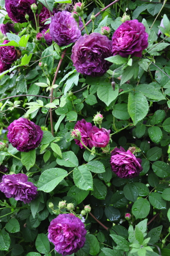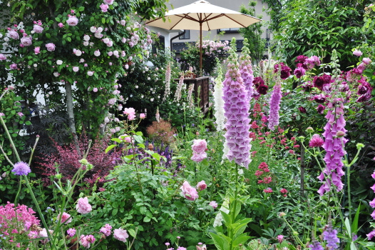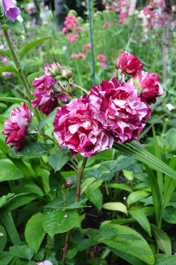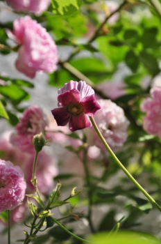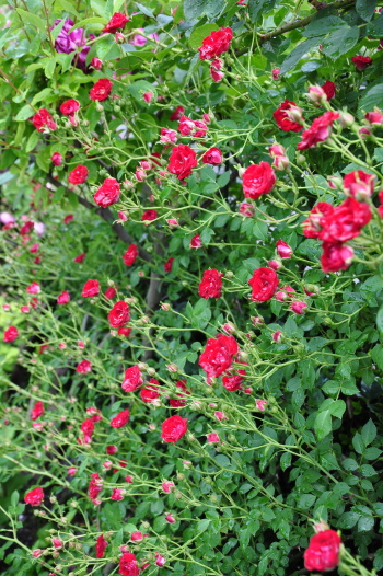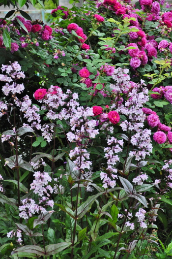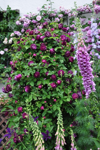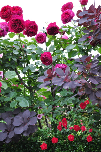 スモークツリー ロイヤルパープルの濃い赤紫の葉でバラの色を沈ませて