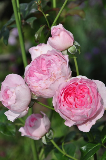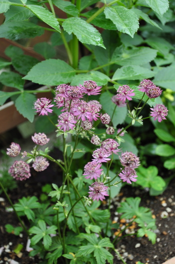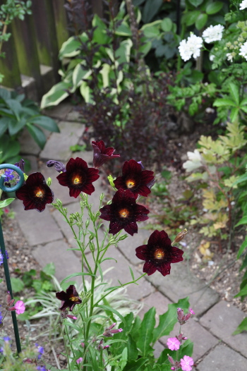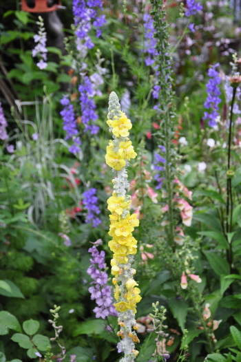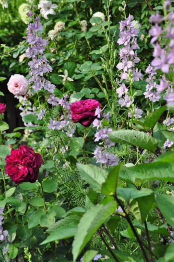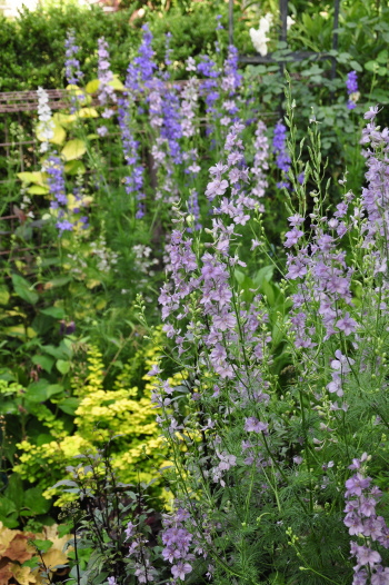 こぼれ種からの開花なのでチドリソウが色々な色が混ざって咲きます
