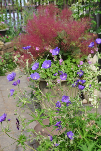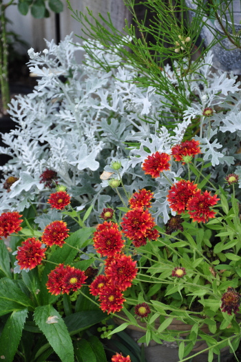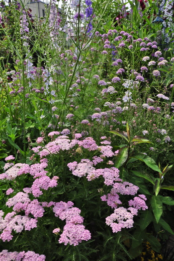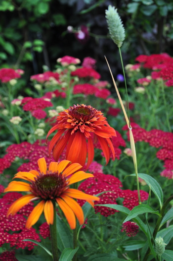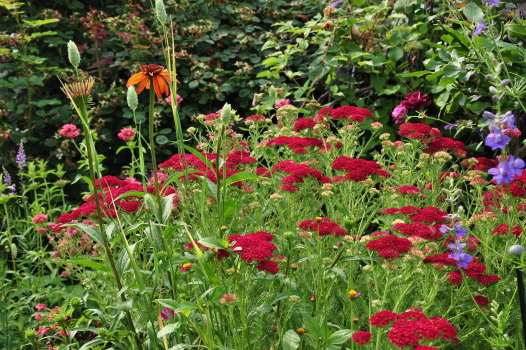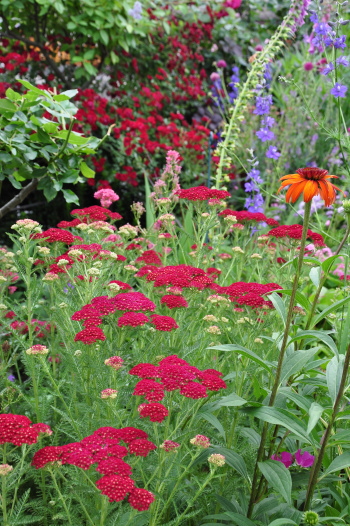 アキレアの赤と後ろで咲くレッドキャスケード、スモークツリーの赤いフワフワのお花ががとてもきれいでした