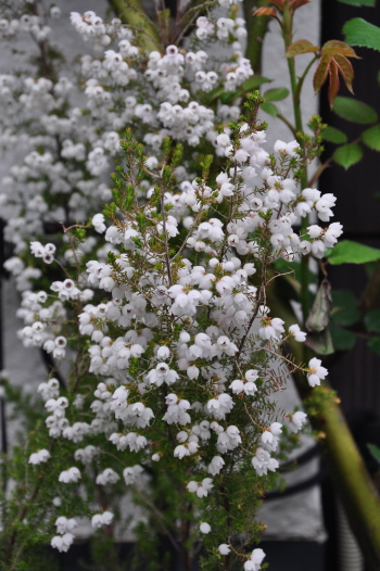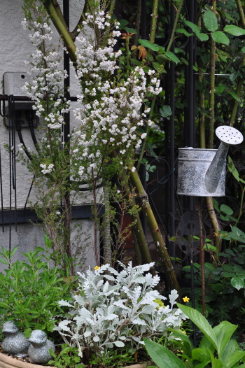 葉を切り戻したり、枝を誘引し直したり、クレマチスの誘引をしたり、こぼれ種からのお花を間引きます