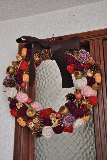 日中は外で庭仕事ができないので少しづつ残った毛糸でお花を編みクリスマスリースを 作りました