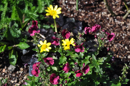 黄色の花はヒメリュウキンカ、赤い花はネメシア ダークマゼンタ