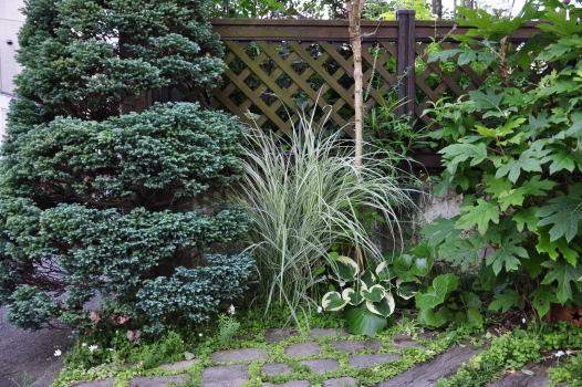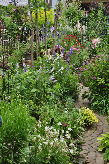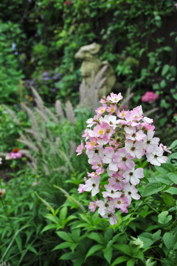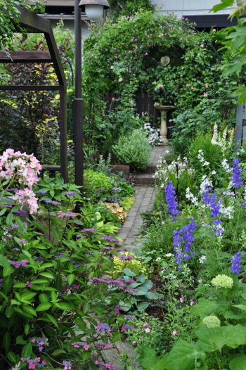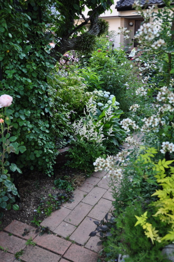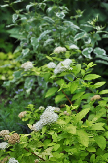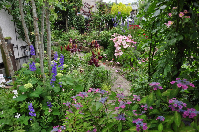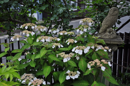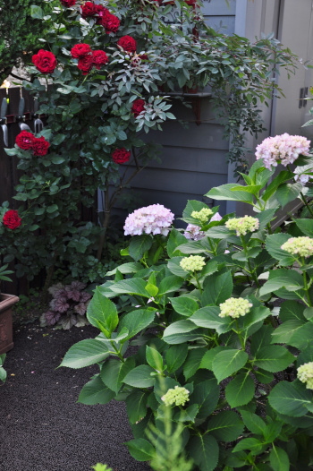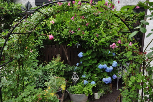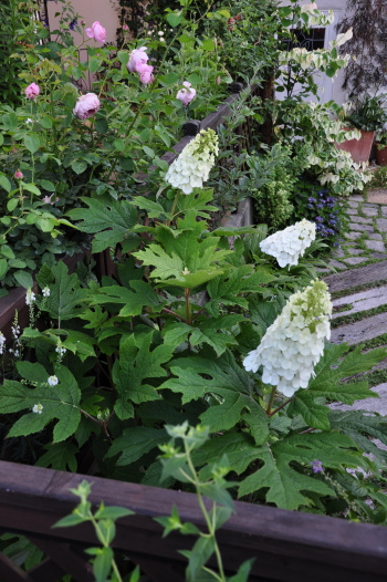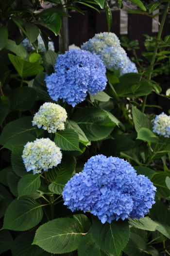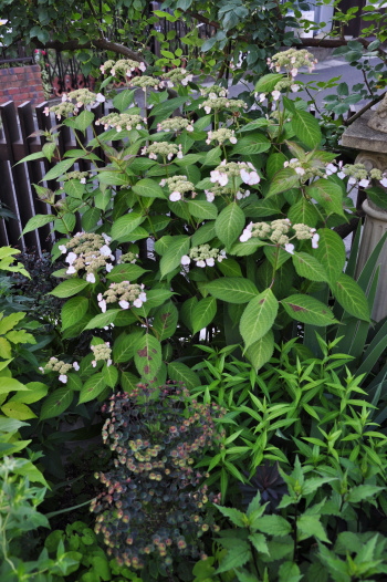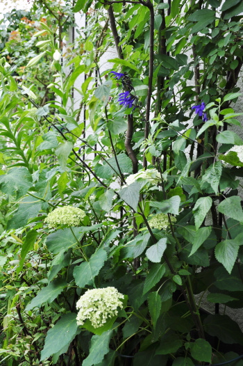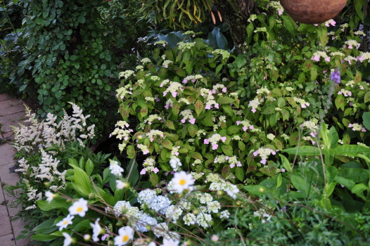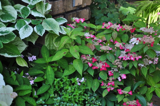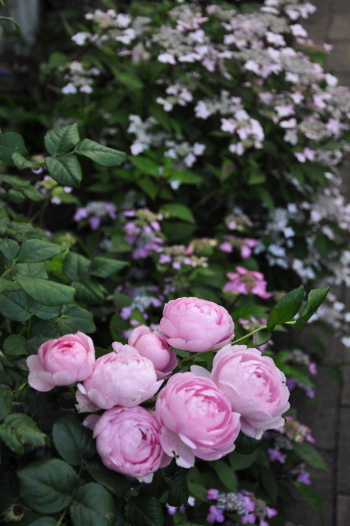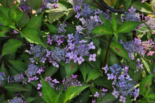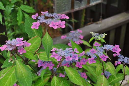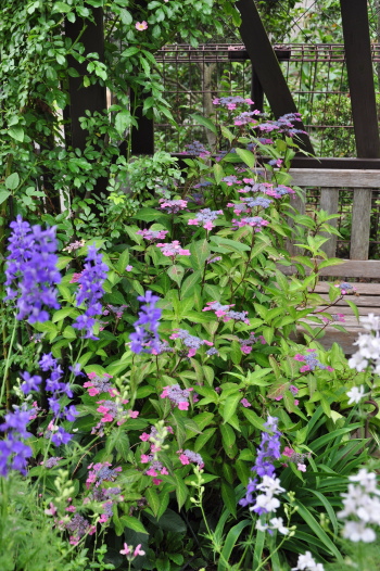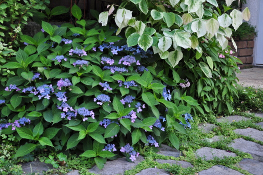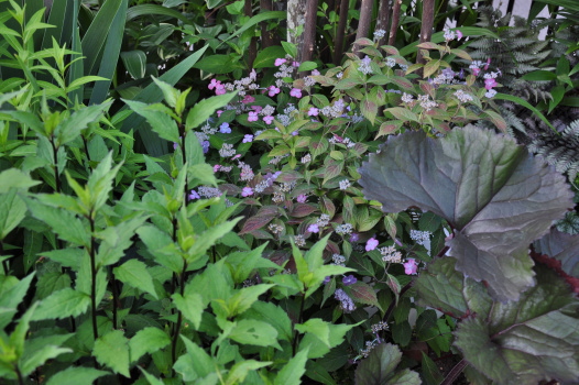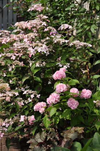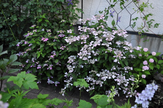 ピンクは名前が不明のヤマアジサイ、淡いブルーの花は桂の舞姫