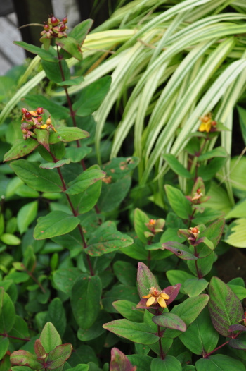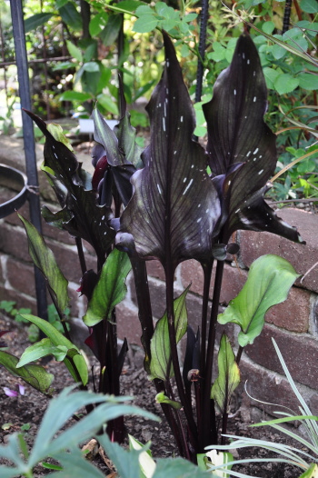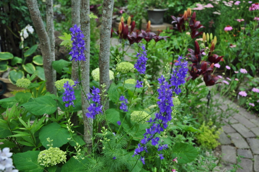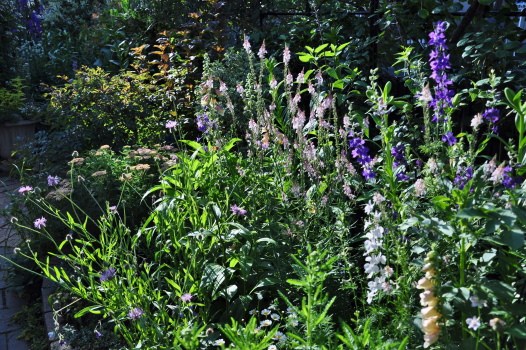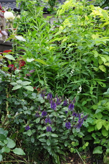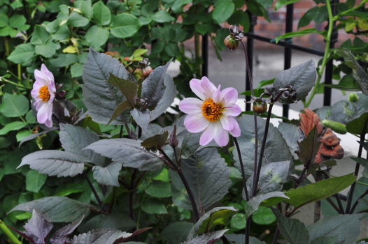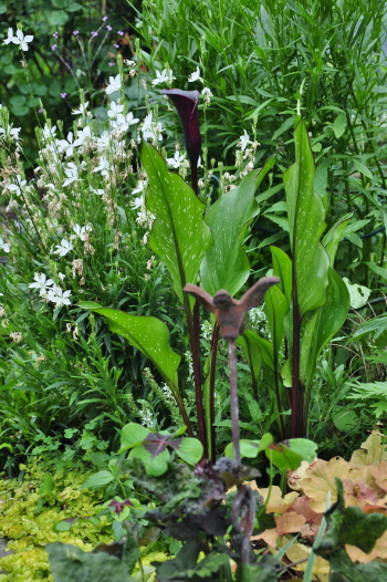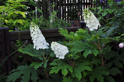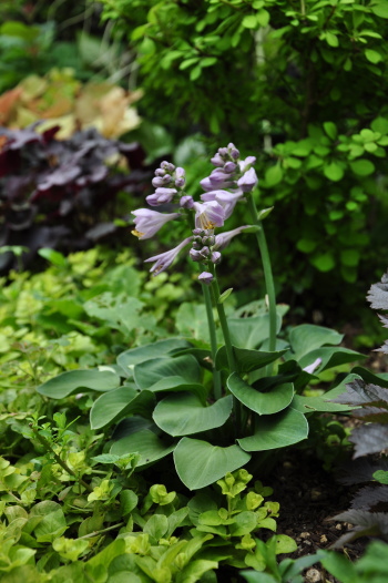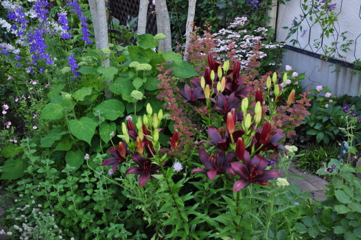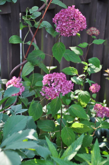 リグラリア ブリットマリー クロフォード、山アジサイ 伊予の薄墨、黒い茎はキヨスミコンギク