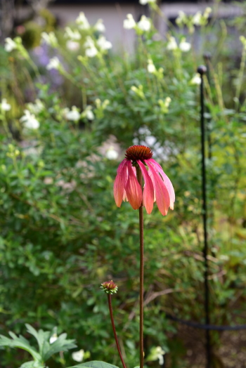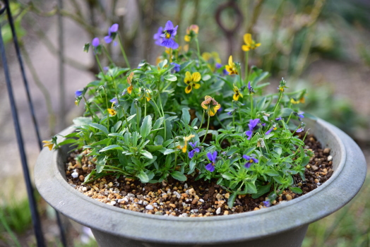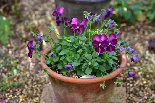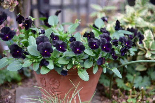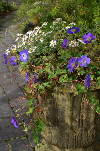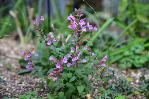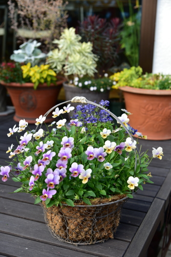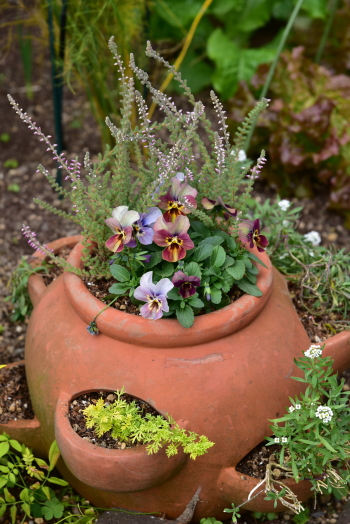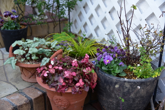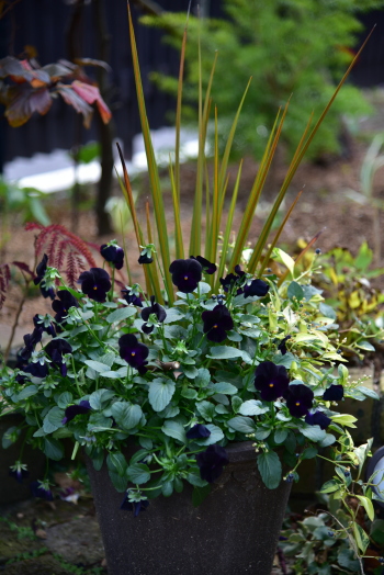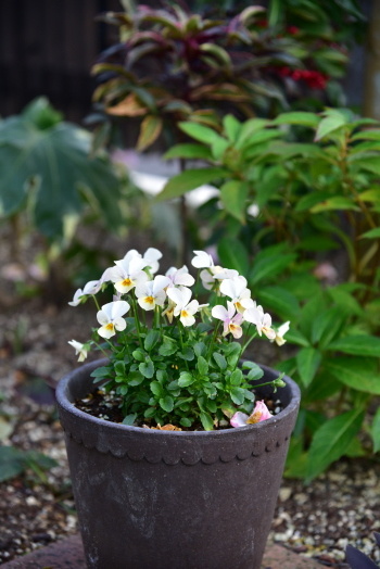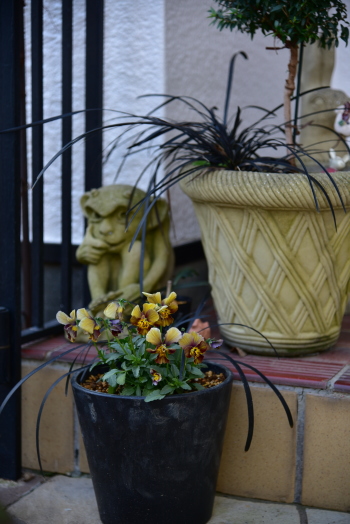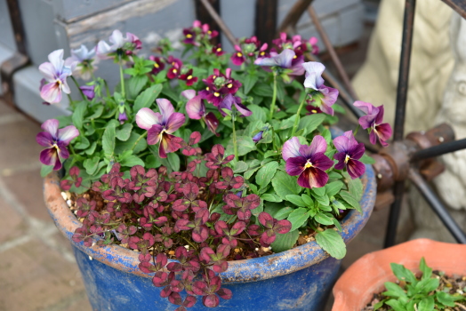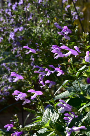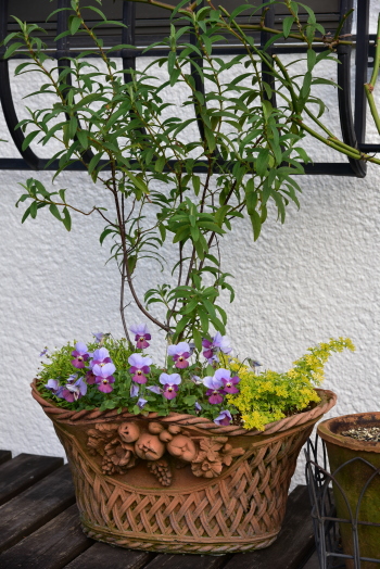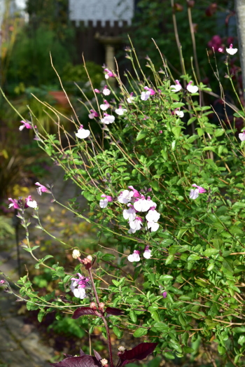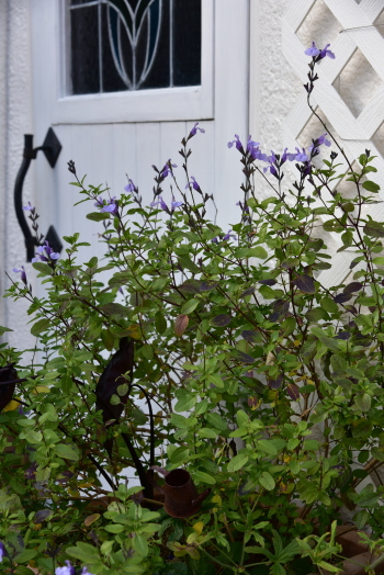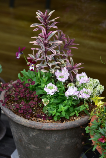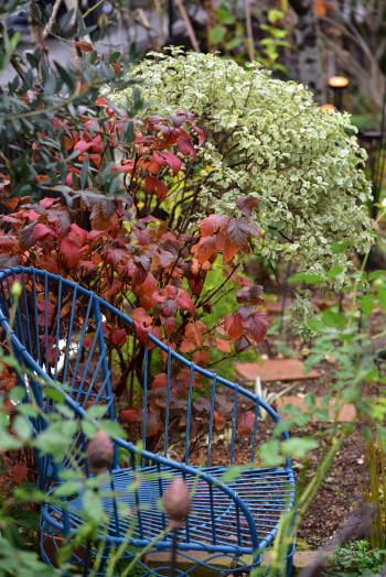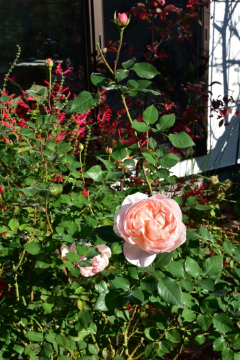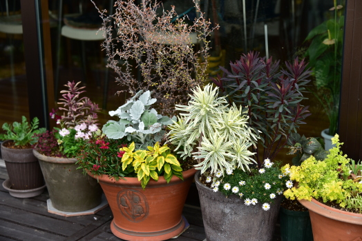 ブッシュのバラとチェリーセージ類がまだ咲いていますが寄せ植えが温かみを感じさせてくれます
