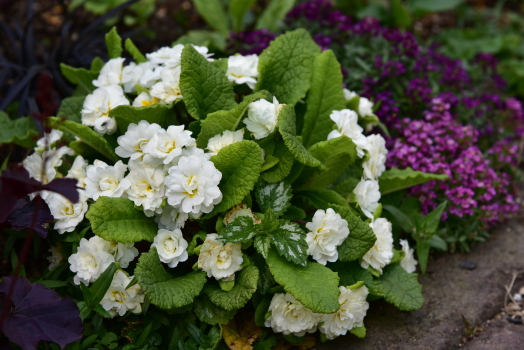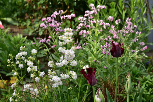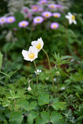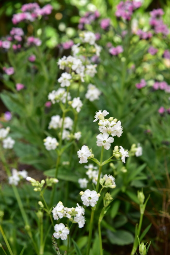 リクニス ビスカリア アルバ シュネー、 後ろに見えるピンクの花はシノグロッサム ミステリーローズ