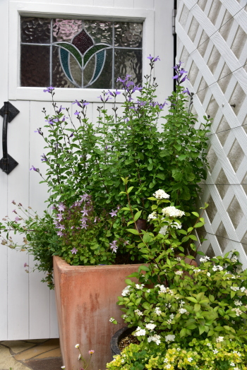 白い花は花笠ウツギ、 四角い鉢の中はサルビアソークール パープルブルー、 カンパニュラリスガンバラエティ
