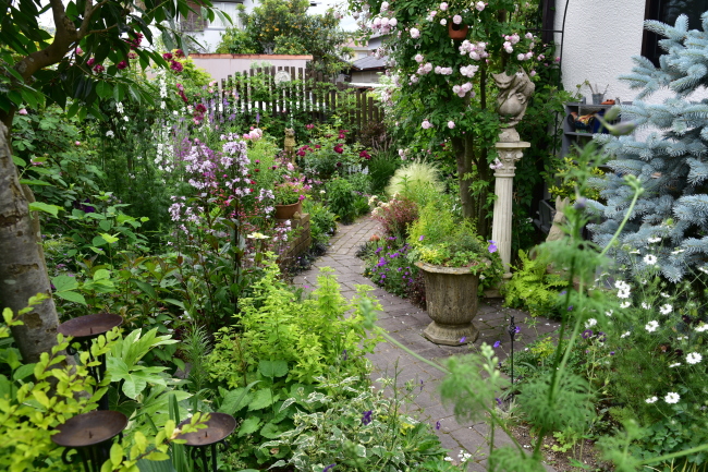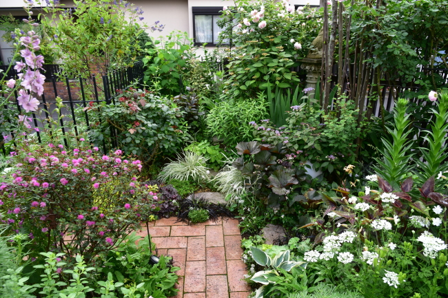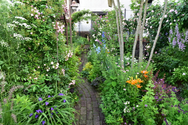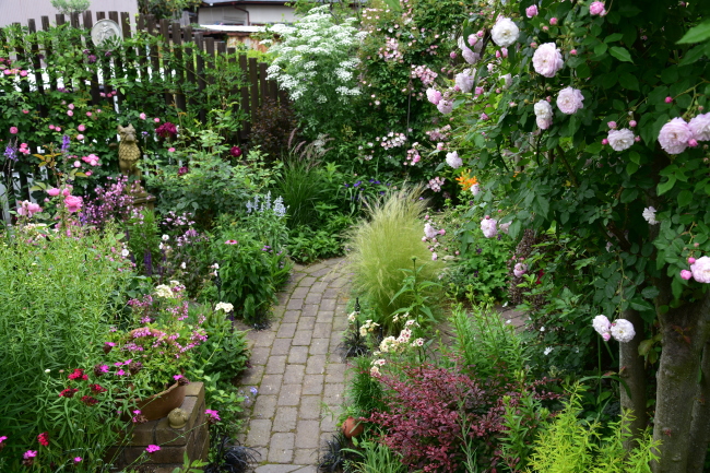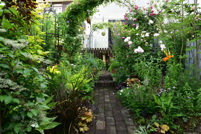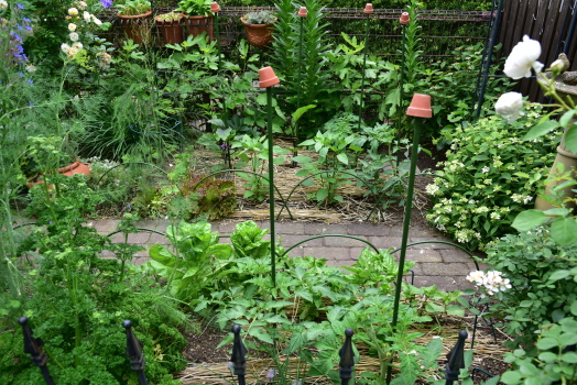 バックヤードから西の小道の一番奥にある小さなキッチンガーデンが見えます