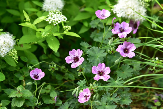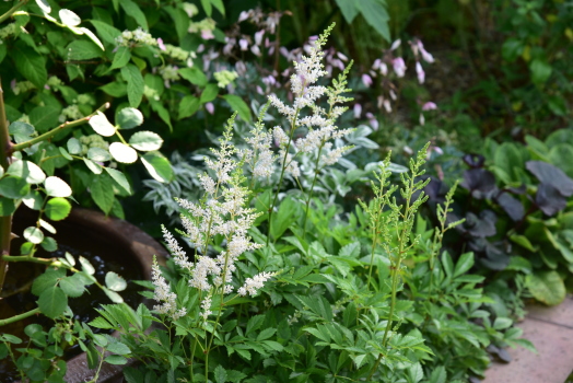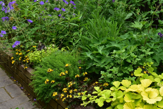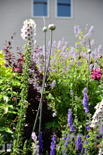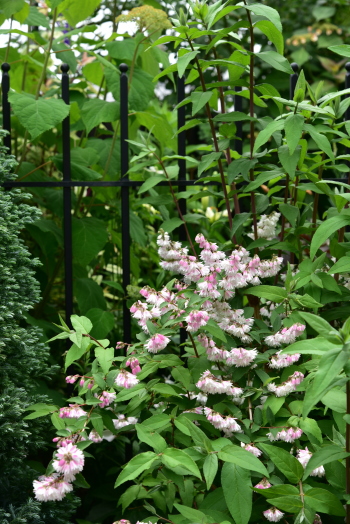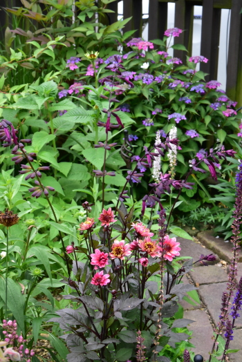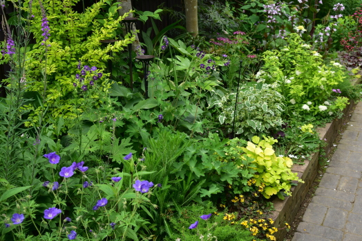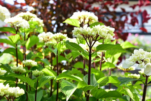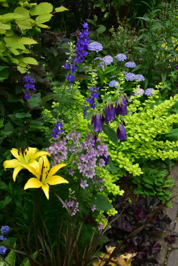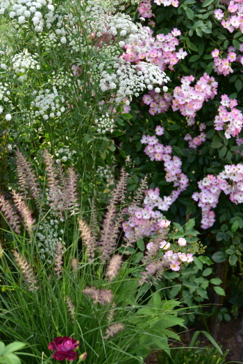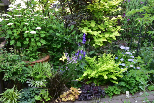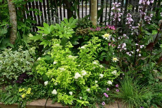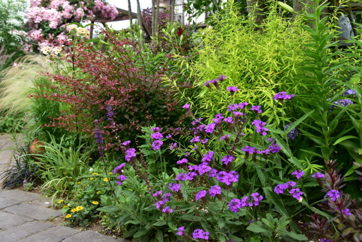 メギ ローズグロー と 黄金ユキヤナギ と バーベナ リギダ ベノーサ‥
