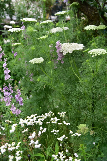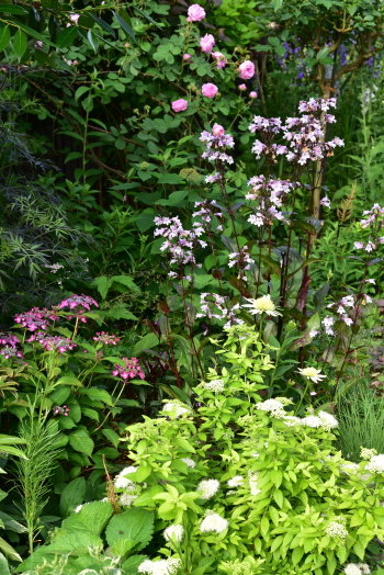 シモツケ ホワイトゴールド、 横のエキナセアはレモンスター