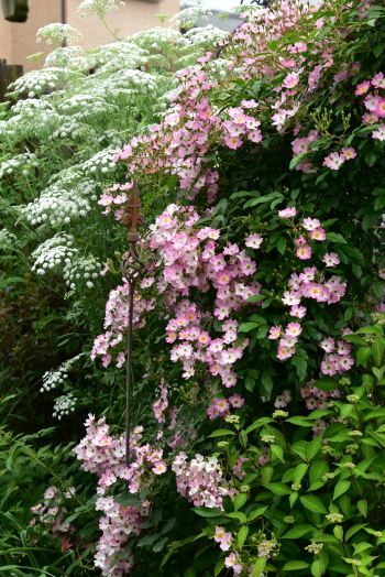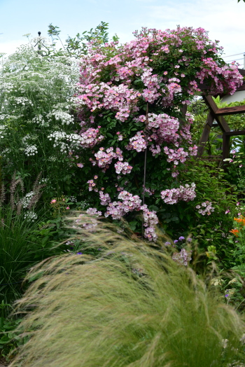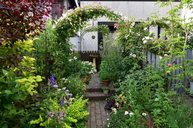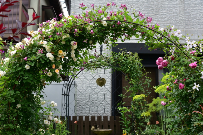 大きなアーチには クレマチス踊場 と ホワイトプリンスチャールズ、 バラはギスレーヌドゥフェリゴンド