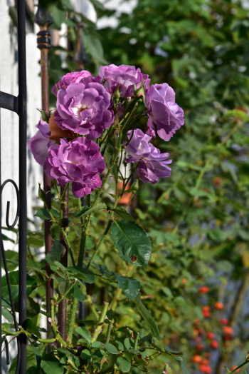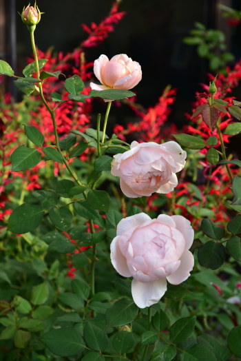 パイナップルセージの細い花弁と真ん丸の赤いカマツカの実、お気に入り