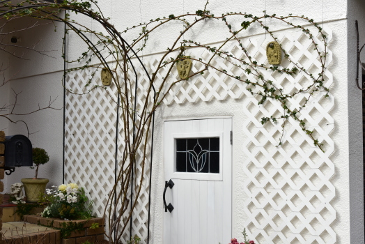 玄関の壁はローラーダボーが誘引してあります