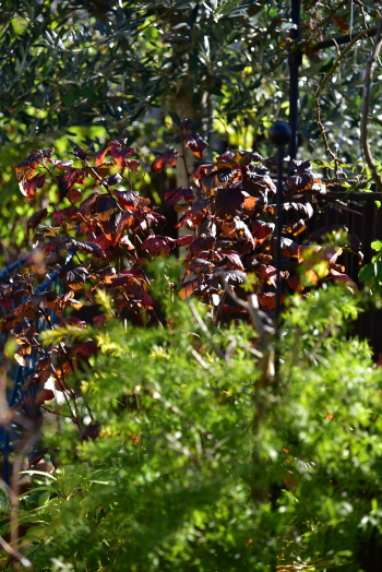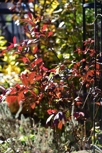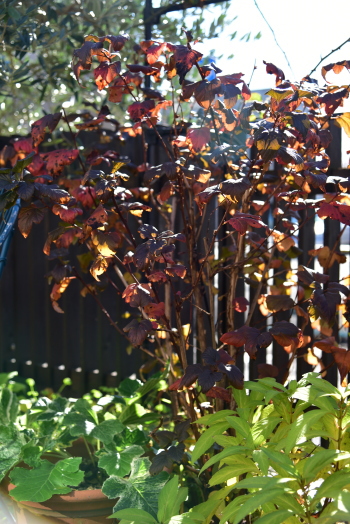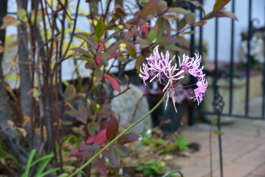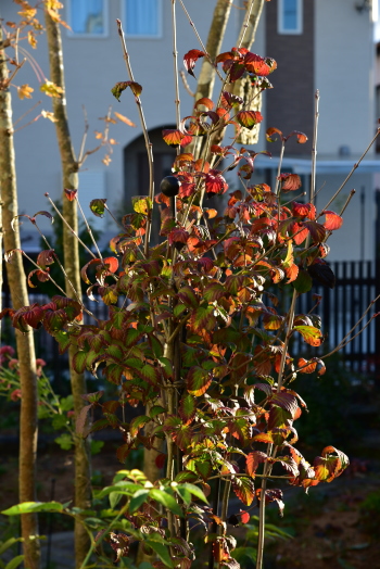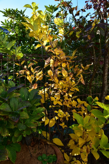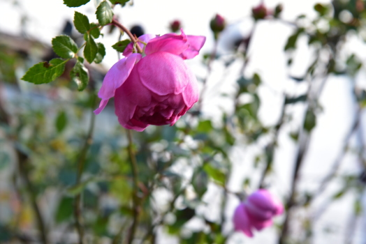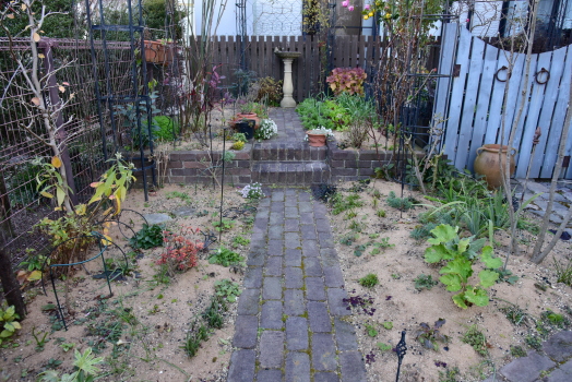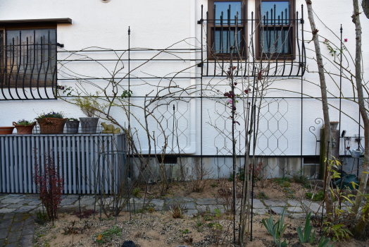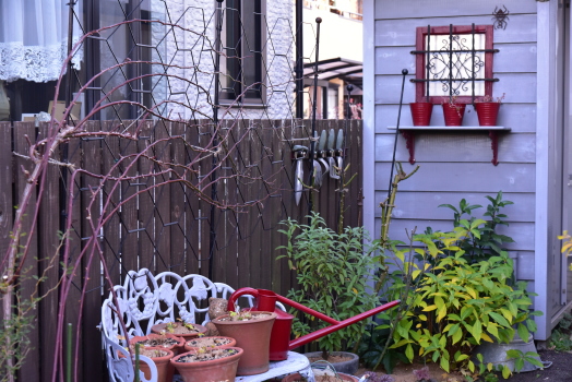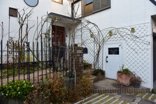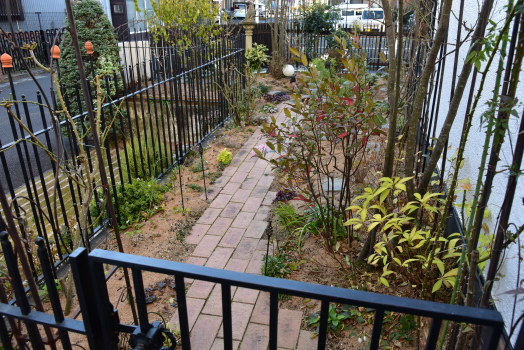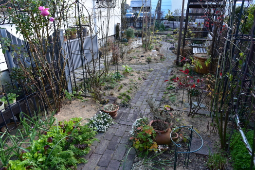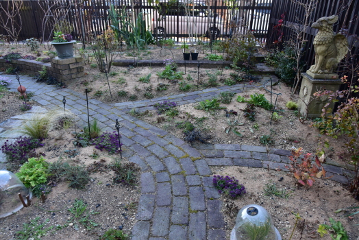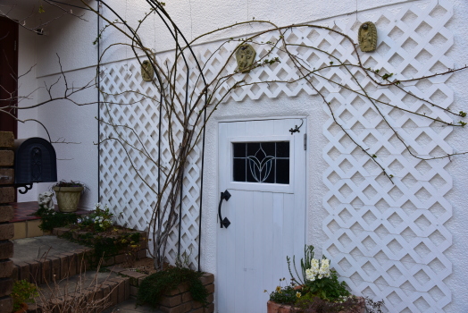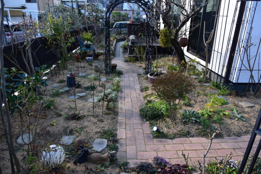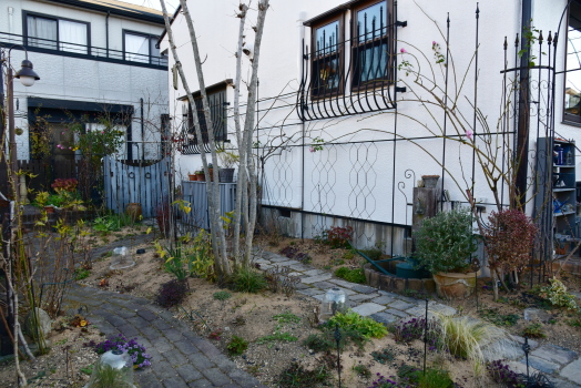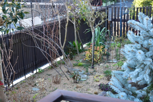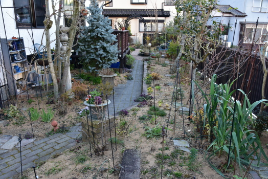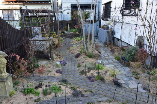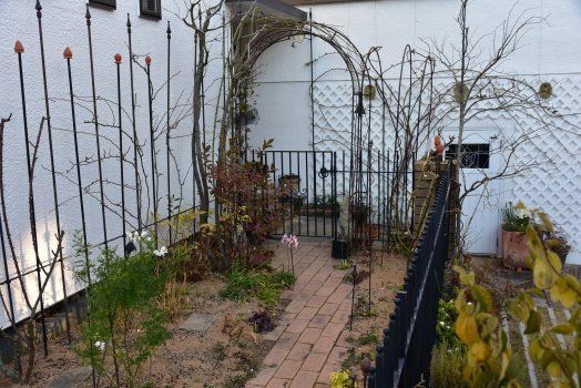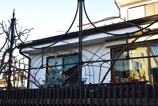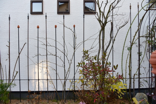 バラの誘引、ブッシュのバラは仮剪定を済ませると引き算が完了したスッキリとした冬の庭になります