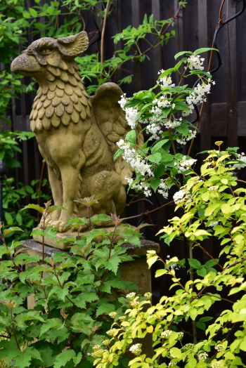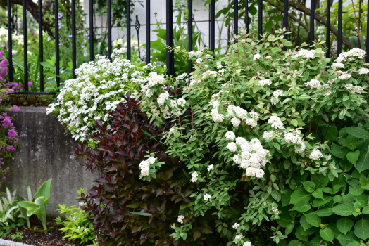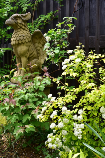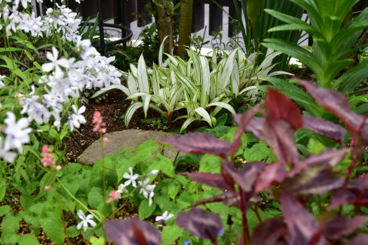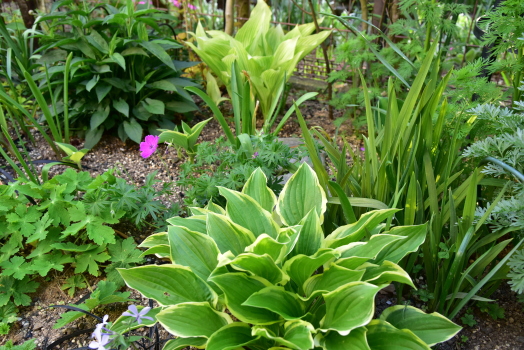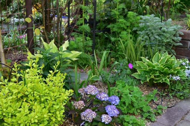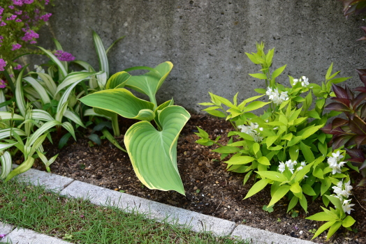 タガネソウ、 ホスタ サガエ、 ヒメウツギ ライムシャンデリア‥