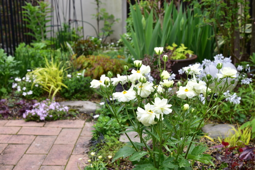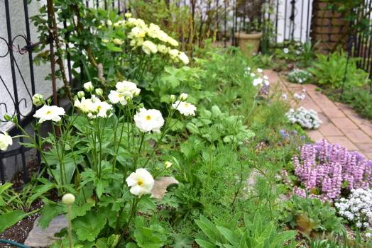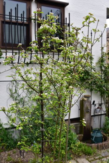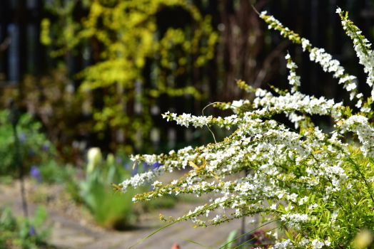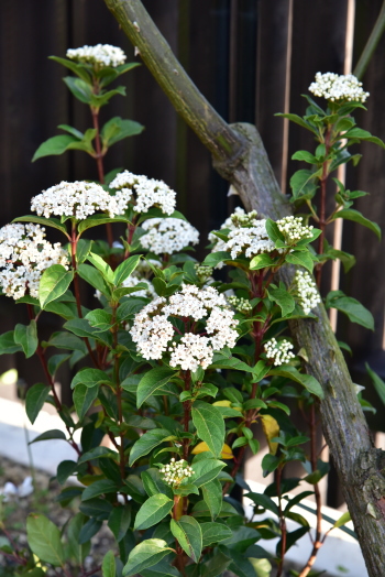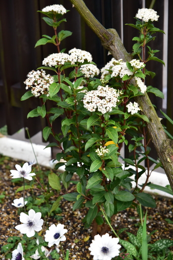板塀前はは コデマリ ゴールドファウンテン、 ビバーナム オノンダカ、 テマリシモツケ リトルデビル‥