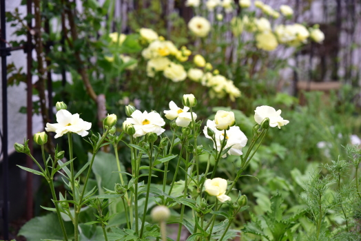 板塀にはアメリカフジ ニベアが誘引されています つぼみが見え始めています