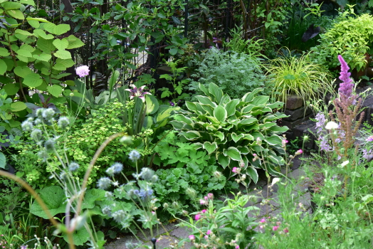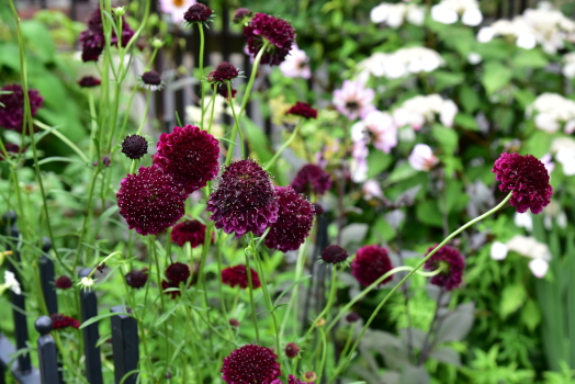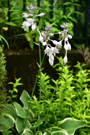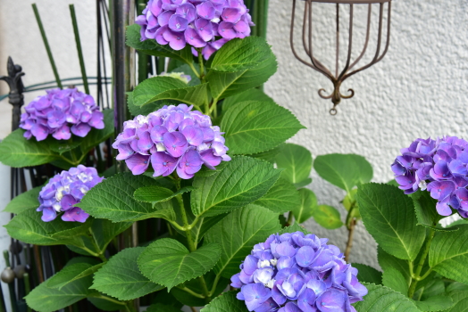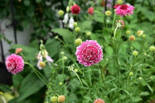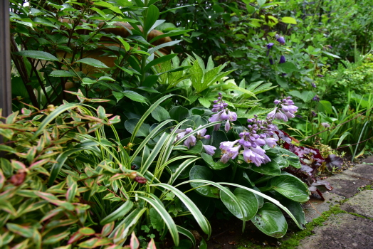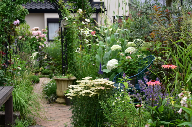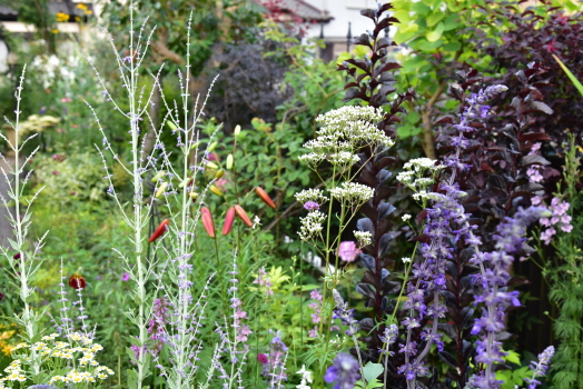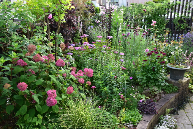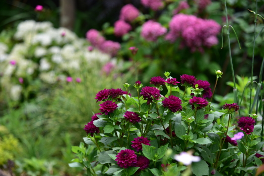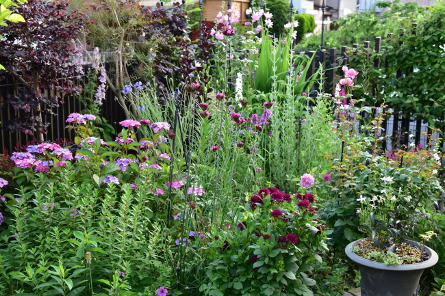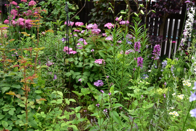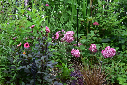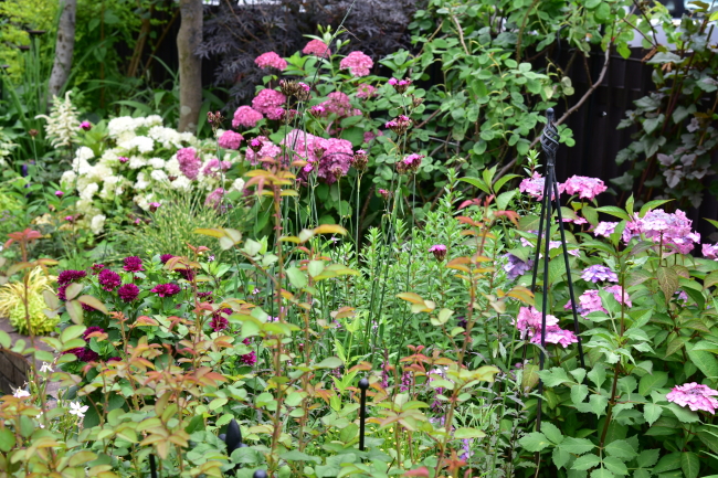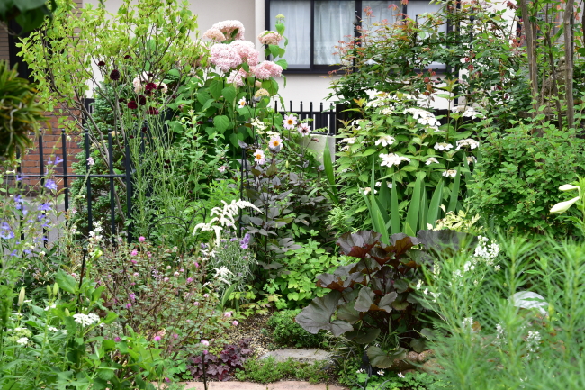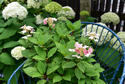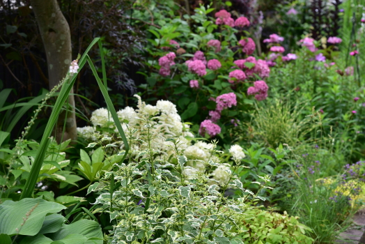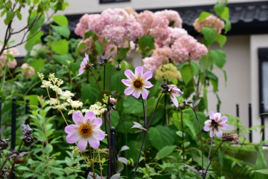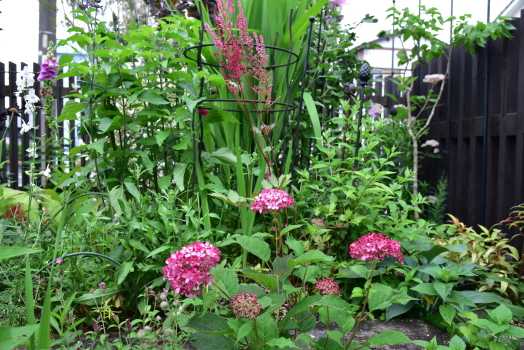 手前から カリガネソウ、 白舞妓、 アナベル ベラアナ‥