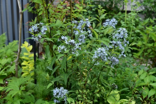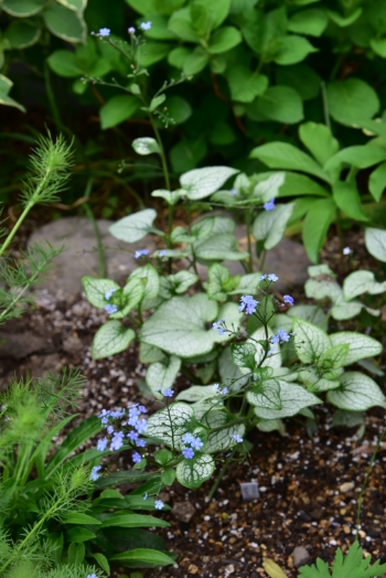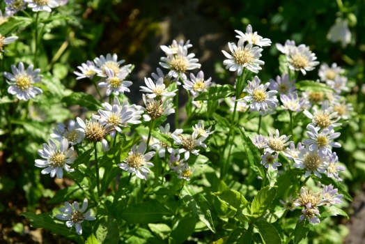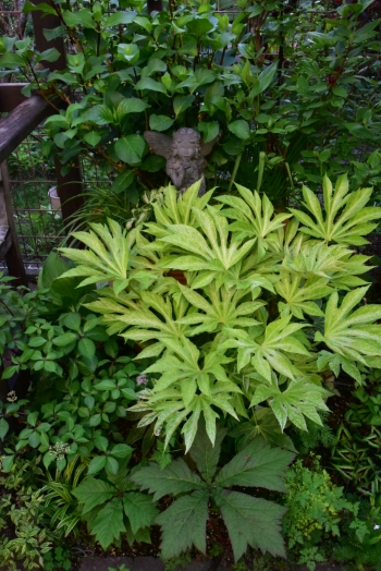 大きな葉どうしの ヤツデ ‘スパイダーウェブ’、 ヤグルマソウ